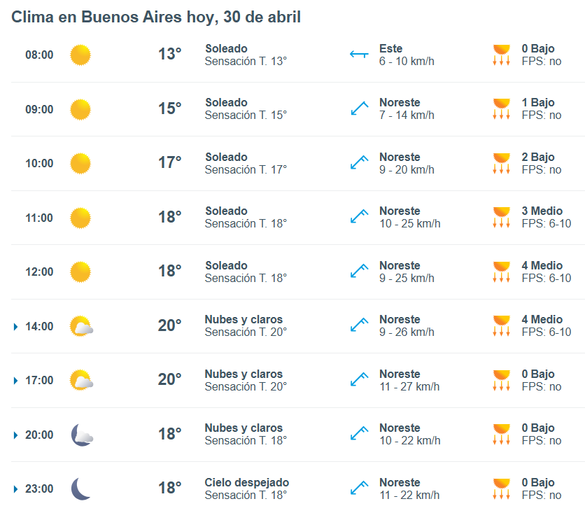 El pronóstico del tiempo para la ciudad de Buenos Aires, indica que hoy 30 de abril el cielo estará ligeramente nublado por la mañana y la temperatura rondará entre 8 grados.