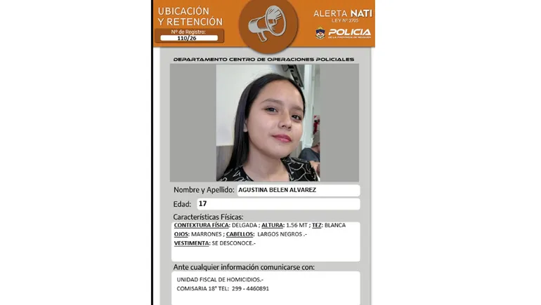 La Policía de Neuquén emitió una Alerta Nati para dar con el paradero de una adolescente de 17 años que desapareció en la ciudad de Neuquén y es buscada intensamente.