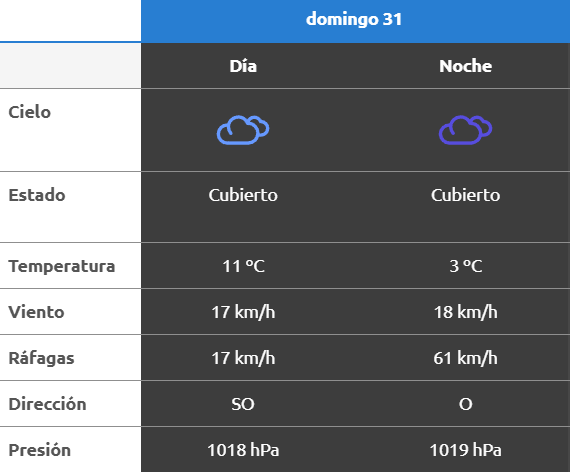 El parte del servicio meteorológico prevé que para después del mediodía el cielo estará nublado y los vientos del sector sudoeste tendrán velocidades estimadas de entre 13 y 22 km/h. La temperatura pronosticada sería de 10 grados.