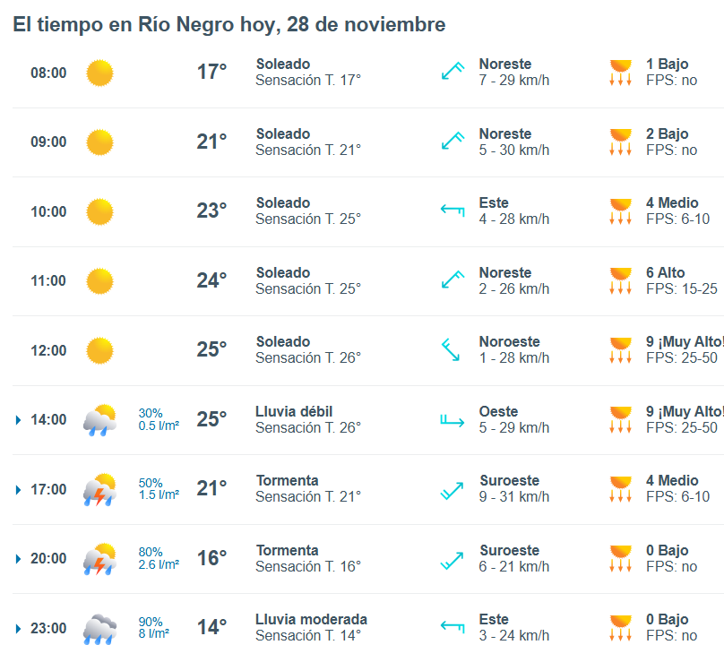 El pronóstico del tiempo para la ciudad de Río Negro, indica que hoy 28 de noviembre el cielo estará parcialmente nublado por la mañana y la temperatura rondará entre 15 grados.