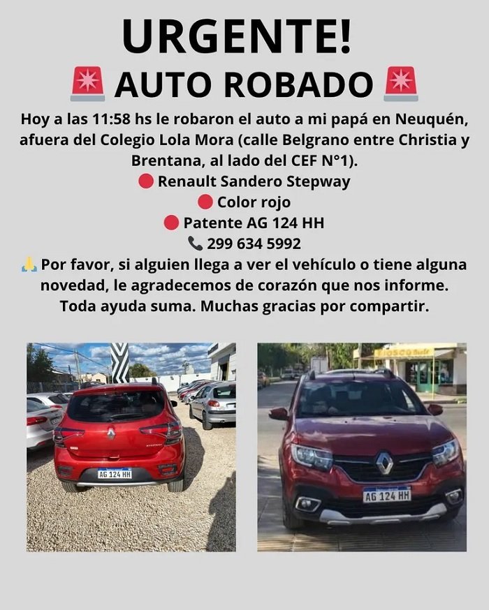 La víctima es Luis Rolando Coria, quien sufrió el robo de su Renault Sandero Stepway rojo, patente AG 124 HH. Su hijo, Pablo Adrián Coria, relató cómo ocurrió el episodio y describió la angustia que atraviesa la familia desde entonces. “Toda ayuda suma”, es el lema del afiche que están circulando por las redes sociales y whatsapp.”Por favor si alguien llega a ver el vehiculo tiene alguna novedad le agradecemos de corazón que nos informe”, agregaron.