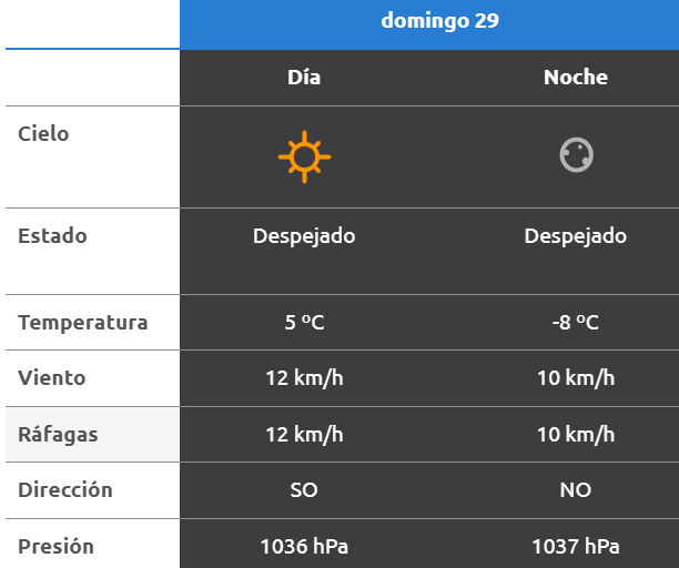 El parte del servicio meteorológico prevé que para después del mediodía el cielo estará mayormente nublado y los vientos del sector norte tendrán velocidades estimadas entre 7 y 12 km/h. La temperatura pronosticada sería de 5 grados.
