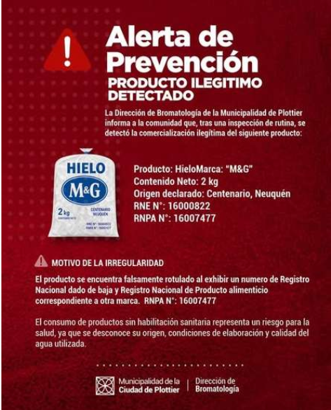 Según informaron, se trata de hielo marca “M&G”, en presentaciones de 2 kilos, que exhibía números de registro nacional inválidos: algunos estaban dados de baja y otros correspondían a una firma distinta. A partir de esta situación, se inició una investigación y se dispuso el retiro inmediato del producto del mercado.