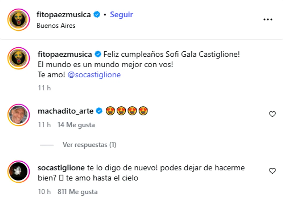 El músico rosarino publicó en su cuenta de Instagram una imagen junto a Gala, acompañada por un mensaje que rápidamente llamó la atención por su tono personal. “Feliz cumpleaños Sofi Gala Castiglione. El mundo es un mundo mejor con vos. Te amo”, escribió Páez.