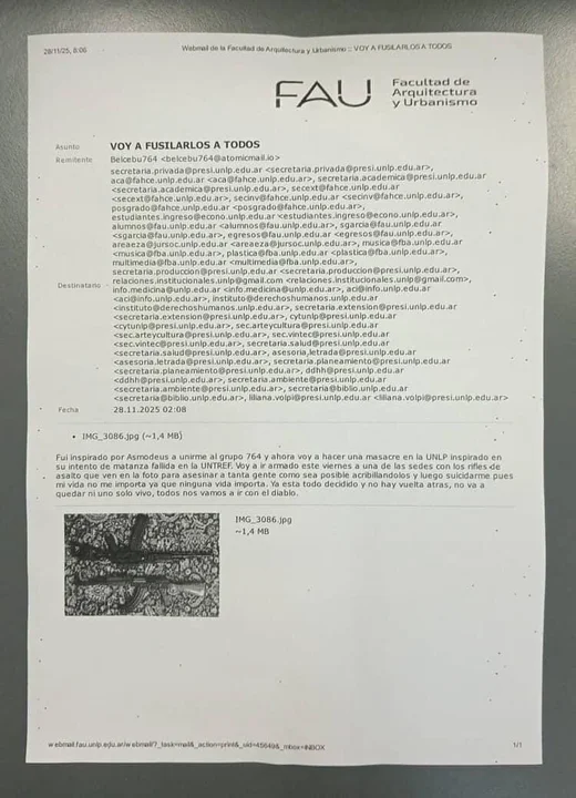El mensaje, enviado desde la cuenta “Belcebu 764” (belcebu764@atomicmalil.io), incluía frases como “voy a fusilarlos a todos” y una descripción detallada del supuesto plan, además de una imagen con dos armas largas, entre ellas un fusil AK-47. Según informaron, el remitente mencionaba estar “inspirado” por un intento de ataque ocurrido en la UNTREF.