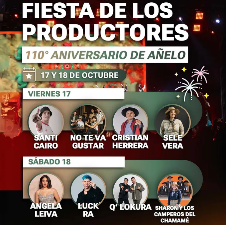 La ciudad de Añelo se prepara para vivir un fin de semana inolvidable con la Fiesta Provincial de los Productores, que se realizará el viernes 17 y sábado 18 de octubre en el predio municipal de la calle 24. El evento, con entrada libre y gratuita, reunirá a familias, trabajadores, productores y visitantes de toda la región en el marco del 110° aniversario de la ciudad.