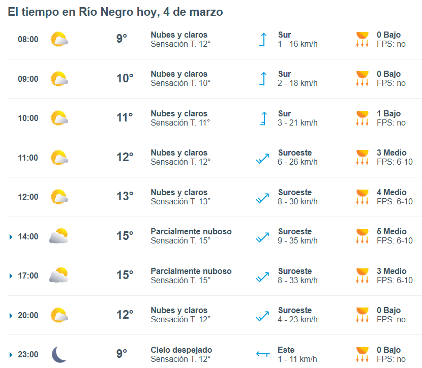 El pronóstico del tiempo para la ciudad de Río Negro, indica que hoy 4 de marzo el cielo estará parcialmente nublado por la mañana y la temperatura rondará entre 7 grados.