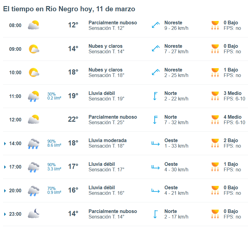 El pronóstico del tiempo para la ciudad de Río Negro, indica que hoy 11 de marzo el cielo estará mayormente nublado por la mañana y la temperatura rondará entre 15 grados.