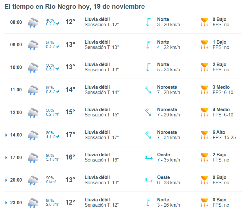 El pronóstico del tiempo para la ciudad de Río Negro, indica que hoy 19 de noviembre el cielo estará mayormente nublado por la mañana y la temperatura rondará entre 12 grados.