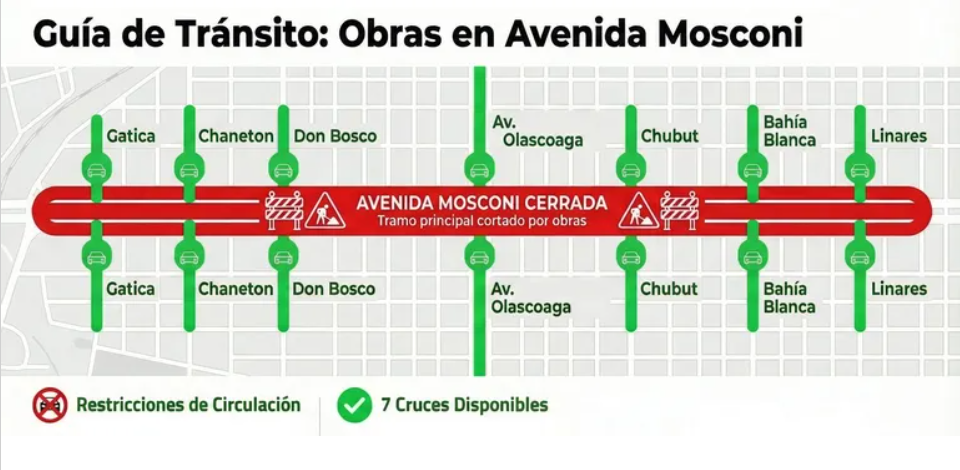 La circulación en la zona de la Avenida Mosconi, en la ciudad de Neuquén, se volvió más compleja tras la instalación total del cerco perimetral que permite avanzar con la obra de transformación en el tramo comprendido entre las calles Linares y Gatica.