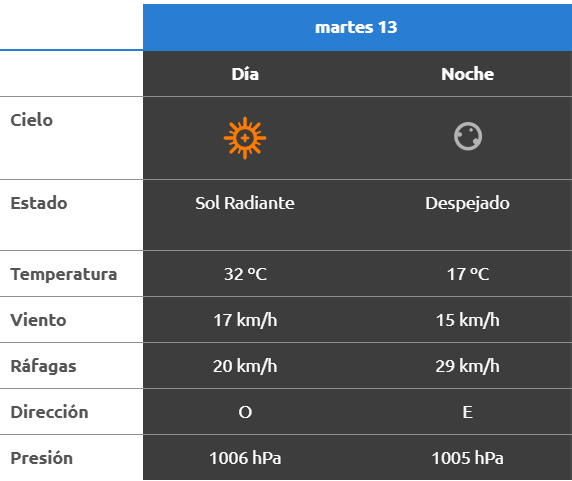 El parte del servicio meteorológico prevé que para después del mediodía el cielo estará algo nublado y los vientos del sector noroeste tendrán velocidades estimadas entre 13 y 22 km/h. La temperatura pronosticada sería de 32 grados.