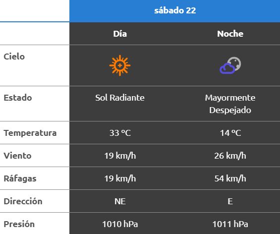 De acuerdo al parte del Servicio Meteorológico Nacional, el clima se presentaría sin lluvias, y los vientos del sur correrán a una velocidad de entre 13 y 22 kilómetros por hora. La humedad sería del 52 por ciento, y la visibilidad sería buena.