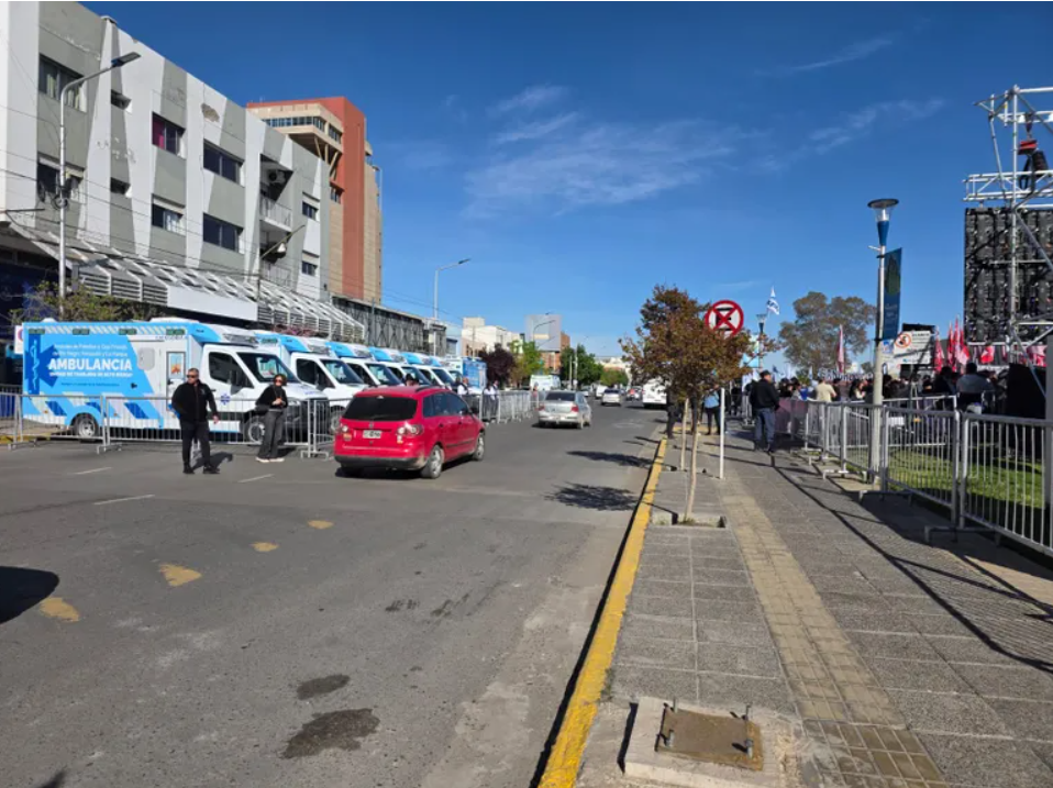 Debido a la presencia de las ambulancias y el montaje del evento, la calle Mitre, a metros de Tierra del Fuego, permanece parcialmente cortada, lo que genera importantes filas de vehículos y afecta también la circulación de varias líneas de colectivos.