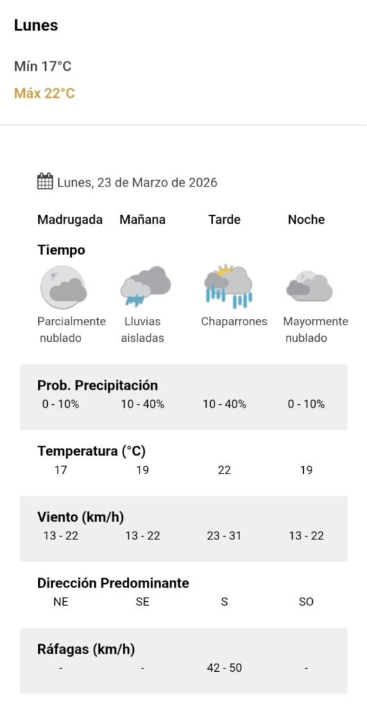 El parte del servicio meteorológico prevé que para después del mediodía el cielo estará con chaparrones y los vientos del sector sur tendrán velocidades estimadas de entre 23 y 31 km/h. La temperatura pronosticada sería de 22 grados.