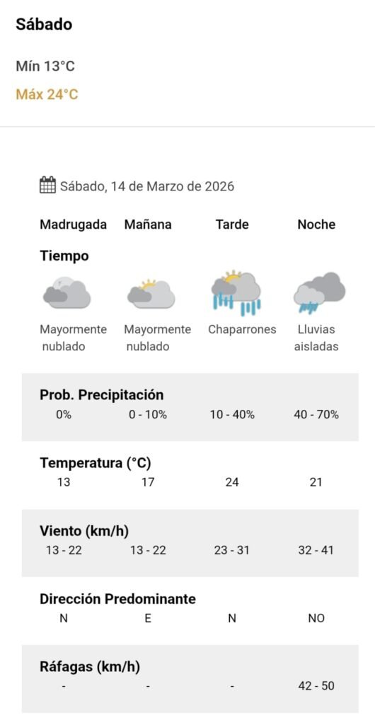 Durante la tarde el cielo estará con lluvias fuertes y los vientos del sector oeste tendrán velocidades estimadas de entre 32 y 41 km/h. La temperatura pronosticada sería de 14 grados. A la noche, el clima rondará los 10 grados, mientras que los vientos serán del noroeste y correrán a una velocidad de entre 32 y 41 kilómetros por hora. La probabilidad de lluvia estaría en el orden de entre 70 y 100 por ciento para esta franja del día.