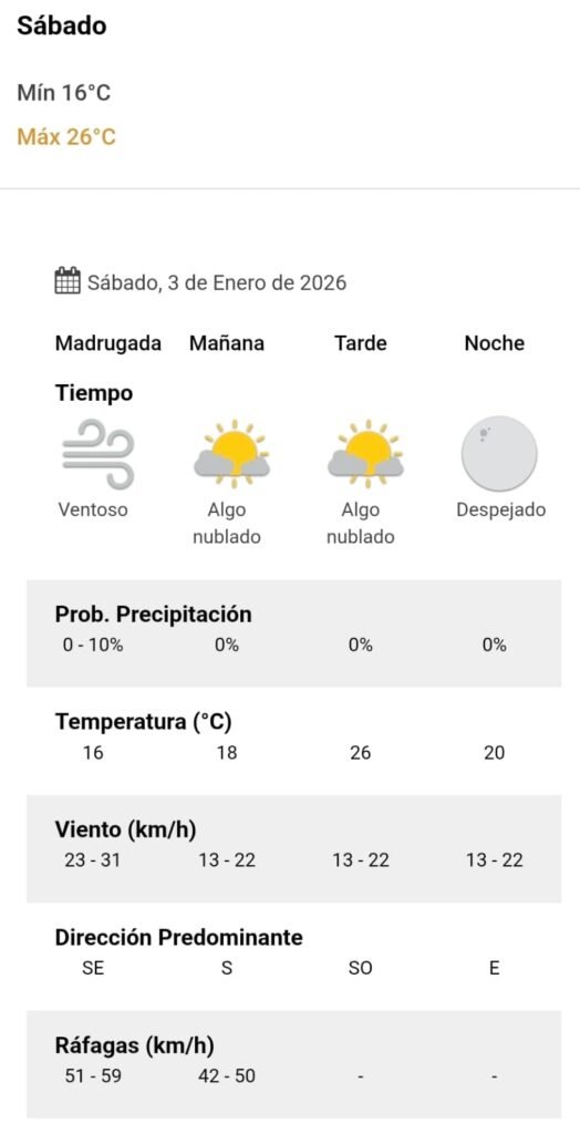 El parte del servicio meteorológico prevé que para después del mediodía el cielo estará algo nublado y los vientos del sector sudoeste tendrán velocidades estimadas de entre 13 y 22 km/h. La temperatura pronosticada sería de 26 grados.