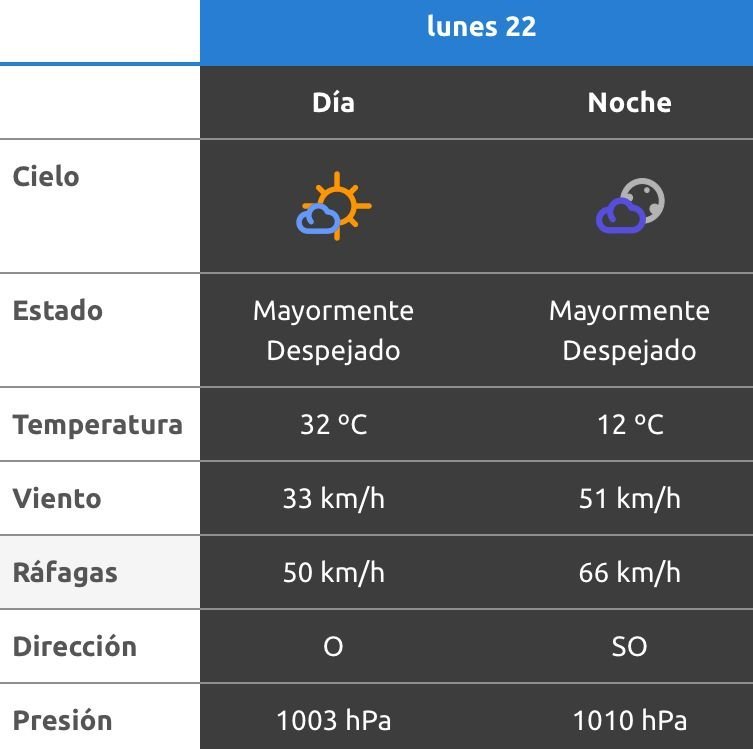 El parte del servicio meteorológico prevé que para después del mediodía el cielo estará parcialmente nublado y los vientos del sector sudoeste tendrán velocidades estimadas de entre 32 y 41 km/h. La temperatura pronosticada sería de 30 grados.