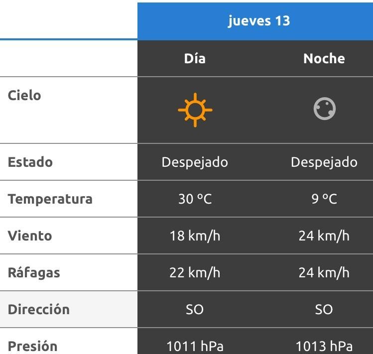 De acuerdo al parte del Servicio Meteorológico Nacional, el clima se presentaría sin lluvias, y los vientos del sur correrán a una velocidad de entre 7 y 12 kilómetros por hora. La humedad sería del 17 por ciento, y la visibilidad sería buena.
