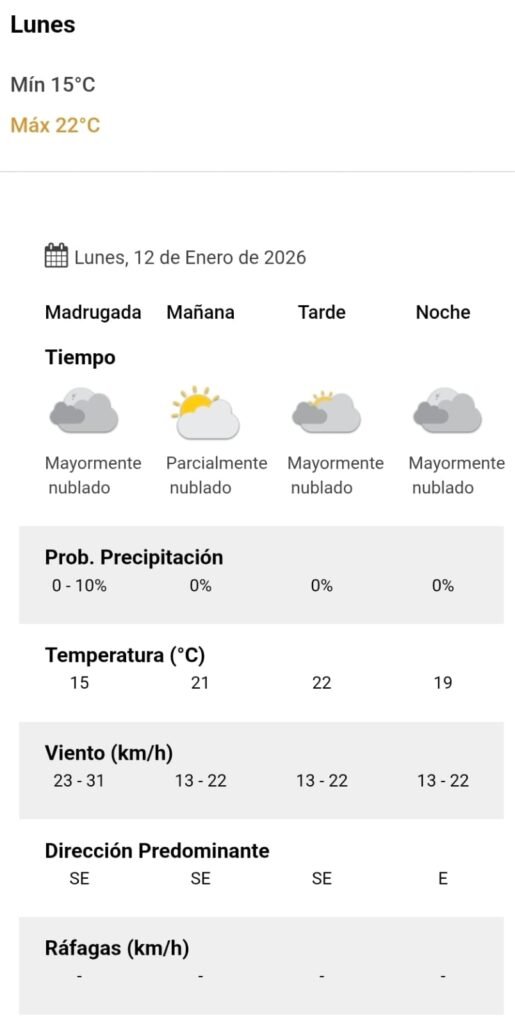 El parte del servicio meteorológico prevé que para después del mediodía el cielo estará mayormente nublado y los vientos del sector sudeste tendrán velocidades estimadas de entre 13 y 22 km/h. La temperatura pronosticada sería de 22 grados.