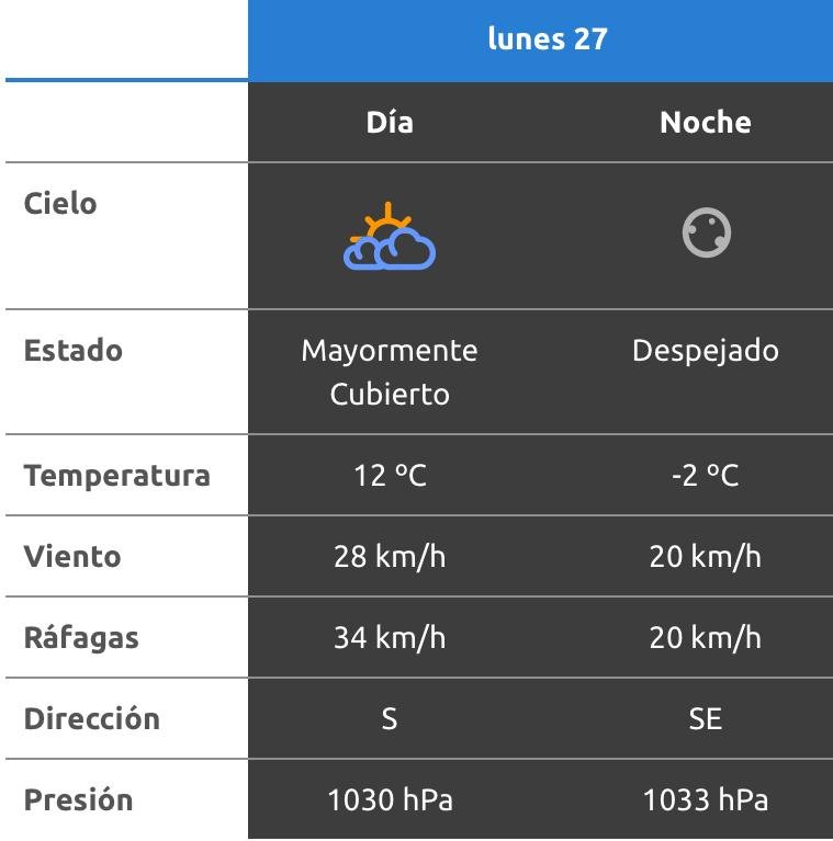 A la noche, el clima rondará los 7 grados, mientras que los vientos serán del norte y soplarán a una velocidad de entre 23 y 31 kilómetros por hora. La probabilidad de lluvia estaría en el orden del por ciento para esta franja del día.