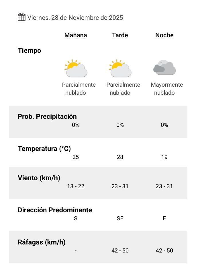 El parte del servicio meteorológico prevé que para después del mediodía el cielo estará parcialmente nublado y los vientos del sector sudeste tendrán velocidades estimadas entre 23 y 31 km/h. La temperatura pronosticada sería de 28 grados.