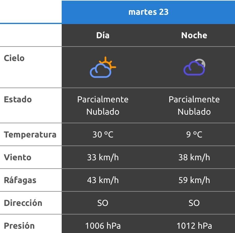 El parte del servicio meteorológico prevé que para después del mediodía el cielo estará algo nublado y los vientos del sector oeste tendrán velocidades estimadas de entre 32 y 41 km/h. La temperatura pronosticada sería de 29 grados.