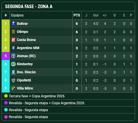 En lo más alto de la tabla se ubican Ciudad Bolívar, que venció a Villa Mitre por 2 a 0 en Bahía Blanca, y Olimpo, que abrió la fecha con un ajustado 1 a 0 sobre Kimberley. Ambos equipos suman puntaje perfecto y marcan el ritmo en esta etapa del torneo.