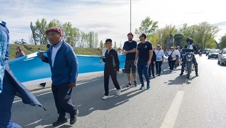 El evento tuvo como punto de partida la plaza del Fortín Primera División, en Cipolletti, donde profesores de educación física coordinaron una entrada en calor antes de iniciar la caminata. Portando una extensa bandera argentina, los participantes cruzaron el puente nuevo rumbo a la capital neuquina, escoltados por motos de la Policía de Río Negro que acompañaron el recorrido y controlaron el tránsito vehicular.