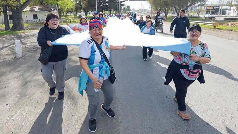 El evento tuvo como punto de partida la plaza del Fortín Primera División, en Cipolletti, donde profesores de educación física coordinaron una entrada en calor antes de iniciar la caminata. Portando una extensa bandera argentina, los participantes cruzaron el puente nuevo rumbo a la capital neuquina, escoltados por motos de la Policía de Río Negro que acompañaron el recorrido y controlaron el tránsito vehicular.