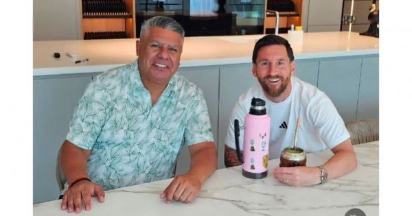 El titular de la Asociación del Fútbol Argentino y el capitán se mostraron sonrientes y con look casual, junto al termo rosa -el color de la casaca del Inter Miami- del anfitrión. Tapia lució una camisa floreada, mientras que el futbolista posó con una camiseta blanca de la marca que viste a la Selección.