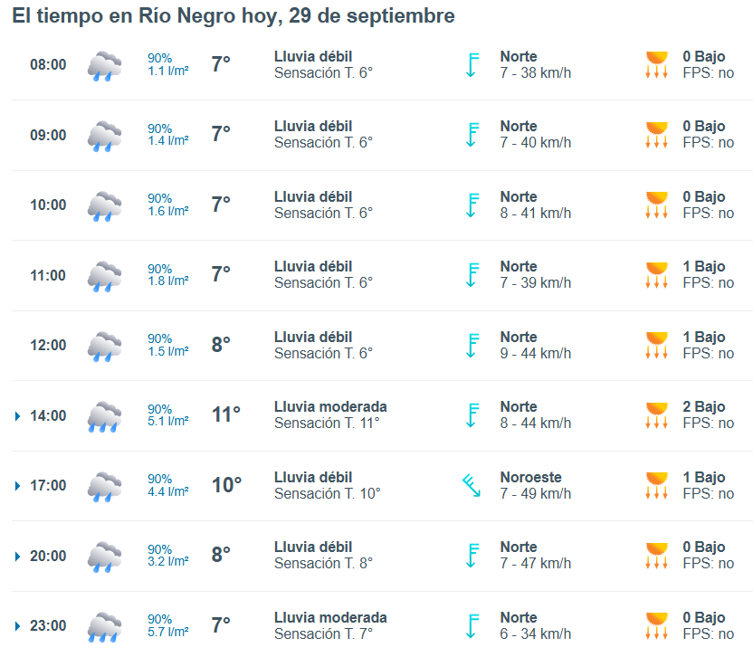 De acuerdo al parte del Servicio Meteorológico Nacional, el clima en esta ciudad de Río Negro presenta una probabilidad de lluvia del 10 por ciento, y los vientos del norte correrán a una velocidad de entre 32 y 41 kilómetros por hora. La humedad sería del 74 por ciento, y la visibilidad sería buena.