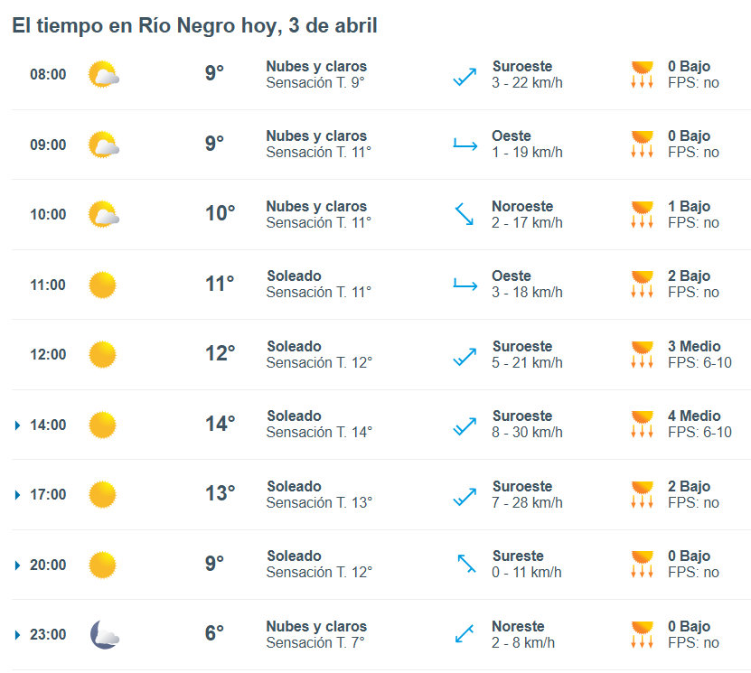De acuerdo al parte del Servicio Meteorológico Nacional, el clima en esta ciudad de Río Negro presenta una probabilidad de lluvia de entre 10 y 40 por ciento, y los vientos del oeste correrán a una velocidad de entre 13 y 22 kilómetros por hora. La humedad sería del 71 por ciento, y la visibilidad sería regular.