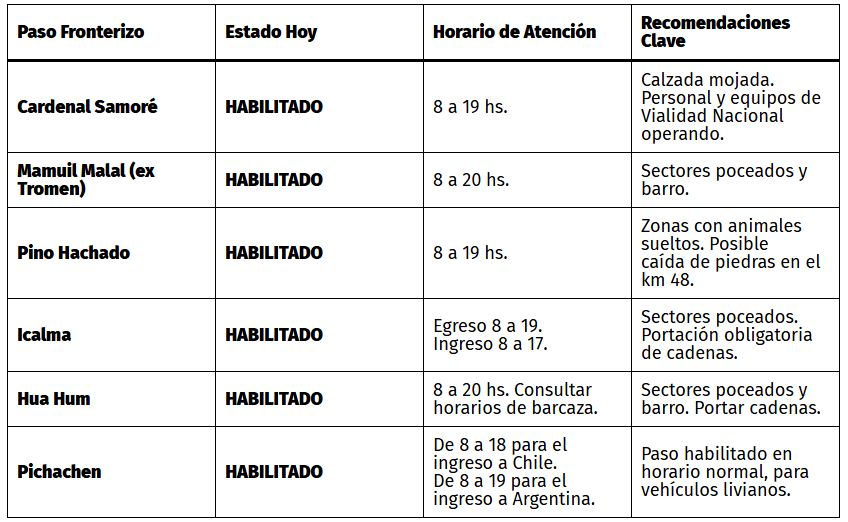 Para cruzar a Chile desde Neuquén o Río Negro hoy , la información oficial es clave. A continuación, te brindamos el reporte actualizado de habilitación de rutas, los horarios de aduana y las precauciones viales que debés tomar.