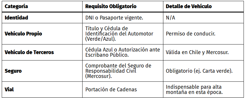 Antes de emprender el cruce hacia Chile desde cualquier punto de Argentina, recordá verificar la siguiente documentación obligatoria: