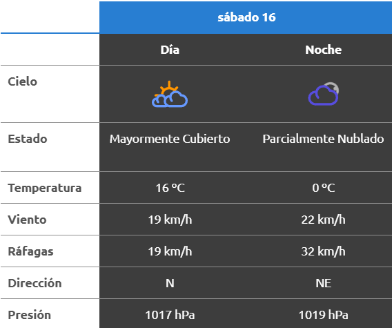 A la noche, el clima rondará los 10 grados, mientras que los vientos serán del noroeste y soplarán a una velocidad de entre 7 y 12 kilómetros por hora. La probabilidad de lluvia estaría en el orden del por ciento para esta franja del día.