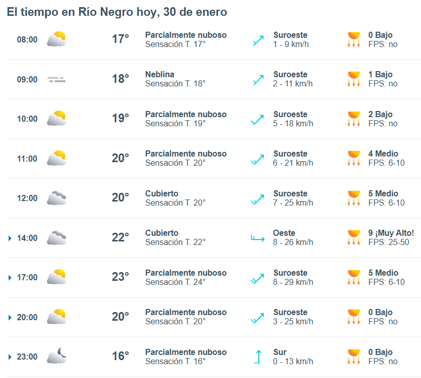 El pronóstico del tiempo para la ciudad de Río Negro, indica que hoy 30 de enero el cielo estará con chaparrones por la mañana y la temperatura rondará entre 24 grados.