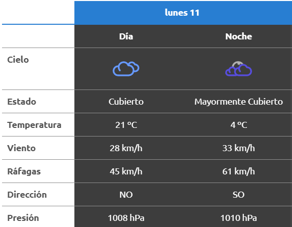 El parte del servicio meteorológico prevé que para después del mediodía el cielo estará mayormente nublado y los vientos del sector oeste tendrán velocidades estimadas de entre 32 y 41 km/h. La temperatura pronosticada sería de 22 grados.