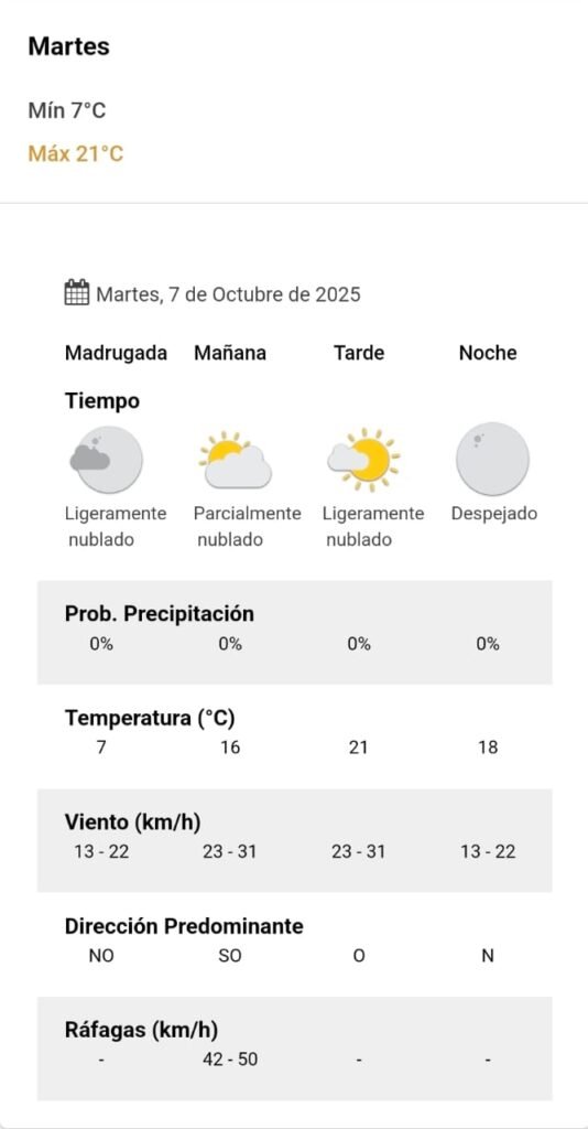 El parte del servicio meteorológico prevé que para después del mediodía el cielo estará ligeramente nublado y los vientos del sector oeste tendrán velocidades estimadas de entre 23 y 31 km/h. La temperatura pronosticada sería de 21 grados.