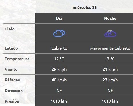 Durante la mañana, el cielo estará parcialmente nublado, con una temperatura de alrededor de 1°C. Los vientos soplarán del norte entre 13 y 22 km/h, la humedad rondará el 45% y la visibilidad será buena. El sol saldrá a las 08:43 y se pondrá a las 18:35.