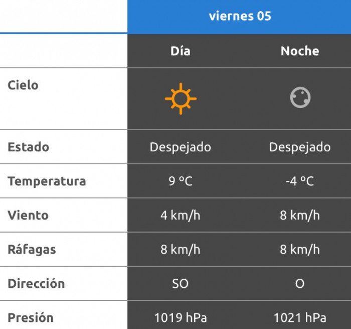 El parte del SMN prevé que para después del mediodía el cielo estará despejado y los vientos del sector norte tendrán velocidades estimadas entre 23 y 31 km/h. La temperatura pronosticada sería de 12 grados.