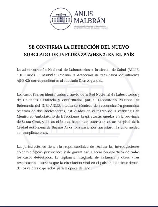 La Administración Nacional de Laboratorios e Institutos de Salud (ANLIS) “Dr. Carlos G. Malbrán” confirmó la identificación de tres casos de influenza A (H3N2) correspondientes al subclado K en el país, detectados mediante secuenciación genómica, según medios.