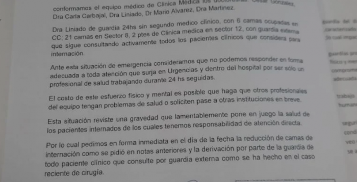 Los profesionales de salud César González, Carla Carbajal, la doctora Linardo, Mario Álvarez y la doctora Matínez formalizaron el pedido a través de una carta dirigida a la subdirectora del centro de salud. Aseguraron estar atravesados por un esfuerzo físico y mental y pidieron la reducción de camas de internación y la derivación de todo paciente clínico que consulte por guardia externa.