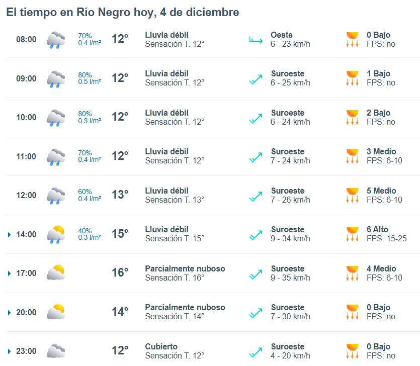 El pronóstico del tiempo para la ciudad de Río Negro, indica que hoy 4 de diciembre el cielo estará con lluvias aisladas por la mañana y la temperatura rondará entre 12 grados.