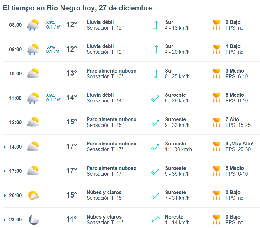 El pronóstico del tiempo para la ciudad de Río Negro, indica que hoy 27 de diciembre el cielo estará mayormente nublado por la mañana y la temperatura rondará entre 11 grados.