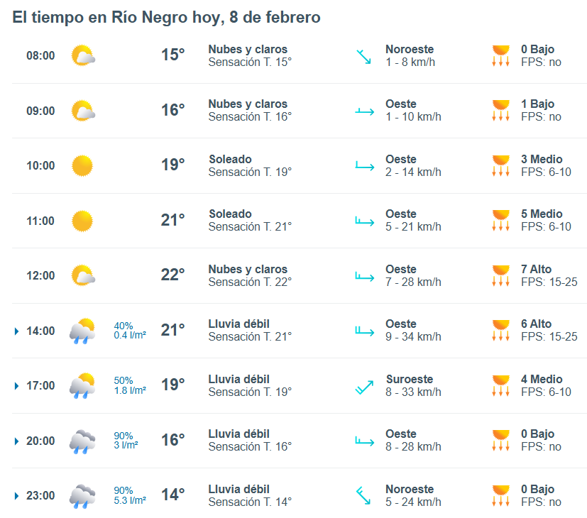 El pronóstico del tiempo para la ciudad de Río Negro, indica que hoy 8 de febrero el cielo estará parcialmente nublado por la mañana y la temperatura rondará entre 14 grados.