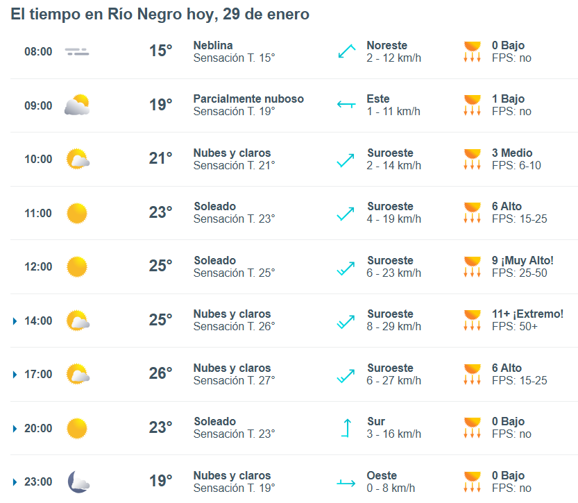 El pronóstico del tiempo para la ciudad de Río Negro, indica que hoy 29 de enero el cielo estará algo nublado por la mañana y la temperatura rondará entre 20 grados.
