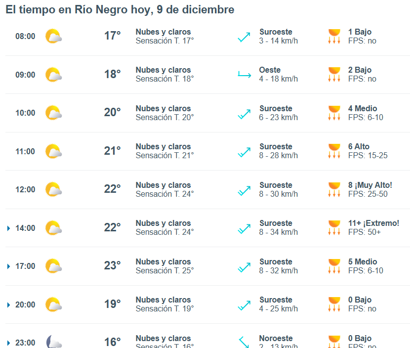 El pronóstico del tiempo para la ciudad de Río Negro, indica que hoy 9 de diciembre el cielo estará mayormente nublado por la mañana y la temperatura rondará entre 20 grados.