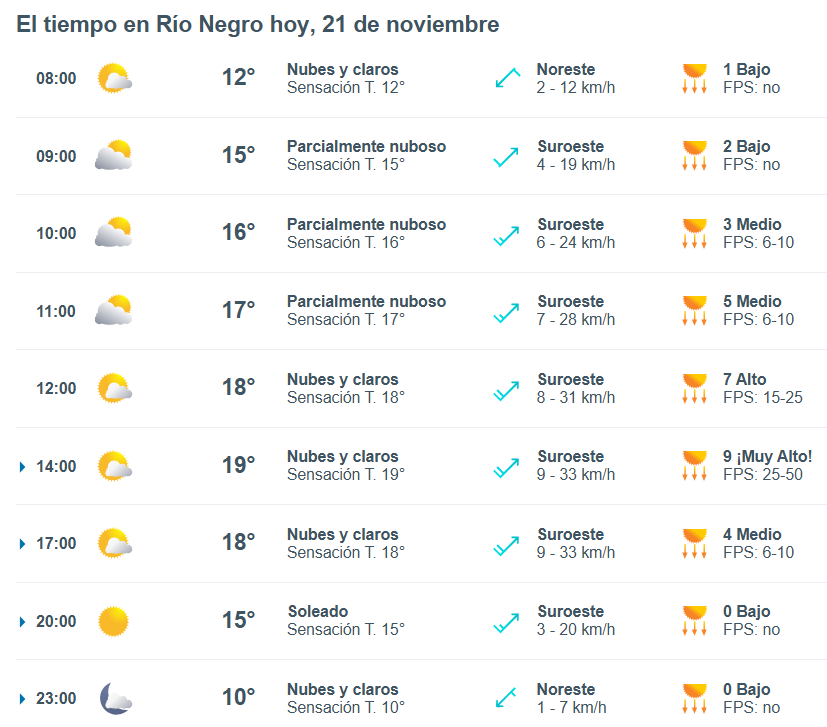 El pronóstico del tiempo para la ciudad de Río Negro, indica que hoy 21 de noviembre el cielo estará mayormente nublado por la mañana y la temperatura rondará entre 12 grados.