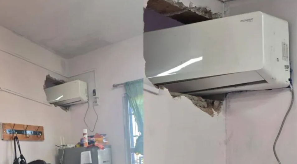 Según las imágenes, para instalar el aire acondicionado fue necesario romper parte del muro que divide ambas oficinas. El resultado es un aparato “partido” entre dos espacios, sin que quede claro cuál de ellos recibe de manera efectiva la climatización.
