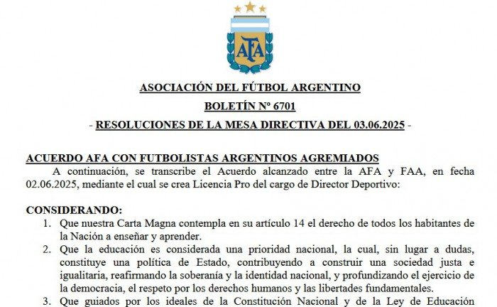 La medida fue oficializada este martes mediante el Boletín N.º 6701, tras un acuerdo con Futbolistas Argentinos Agremiados (FAA), que será el organismo encargado de otorgar y supervisar esta credencial. La licencia también será obligatoria, desde 2027, en Primera B Metropolitana, Primera C, Federal A y la Primera División del fútbol femenino.